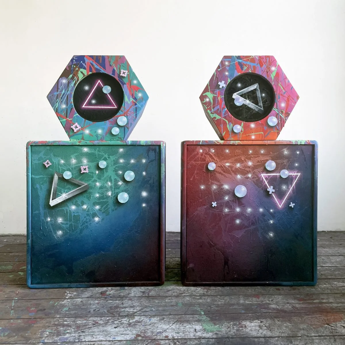 Working directly onto the sculptural casing, luminous gradients, geometric motifs and illusionistic forms unfold across faceted surfaces. Neon triangles, floating spheres and star-like points of light hover against atmospherically layered grounds. The visual language draws on recurring elements within the wider practice, where digitally inflected forms appear suspended in deep, constructed space.