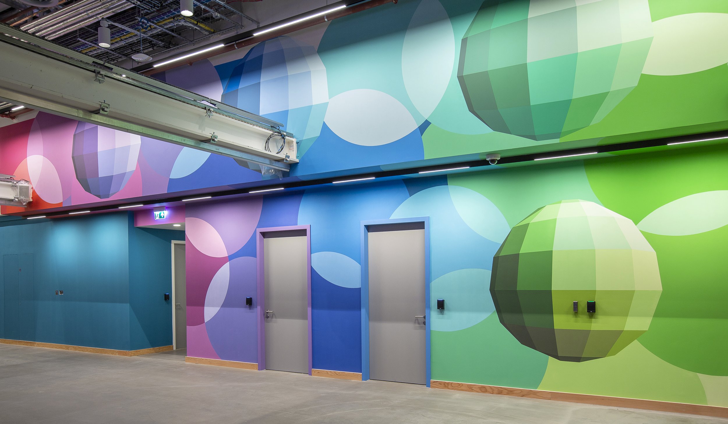 Expansive fields of colour and softly shifting geometric forms extend across the architecture, wrapping the wall in layered gradients and faceted spheres. The imagery draws on the visual language of digital environments while remaining insistently physical in its execution, applied by hand in emulsion directly onto the surface.