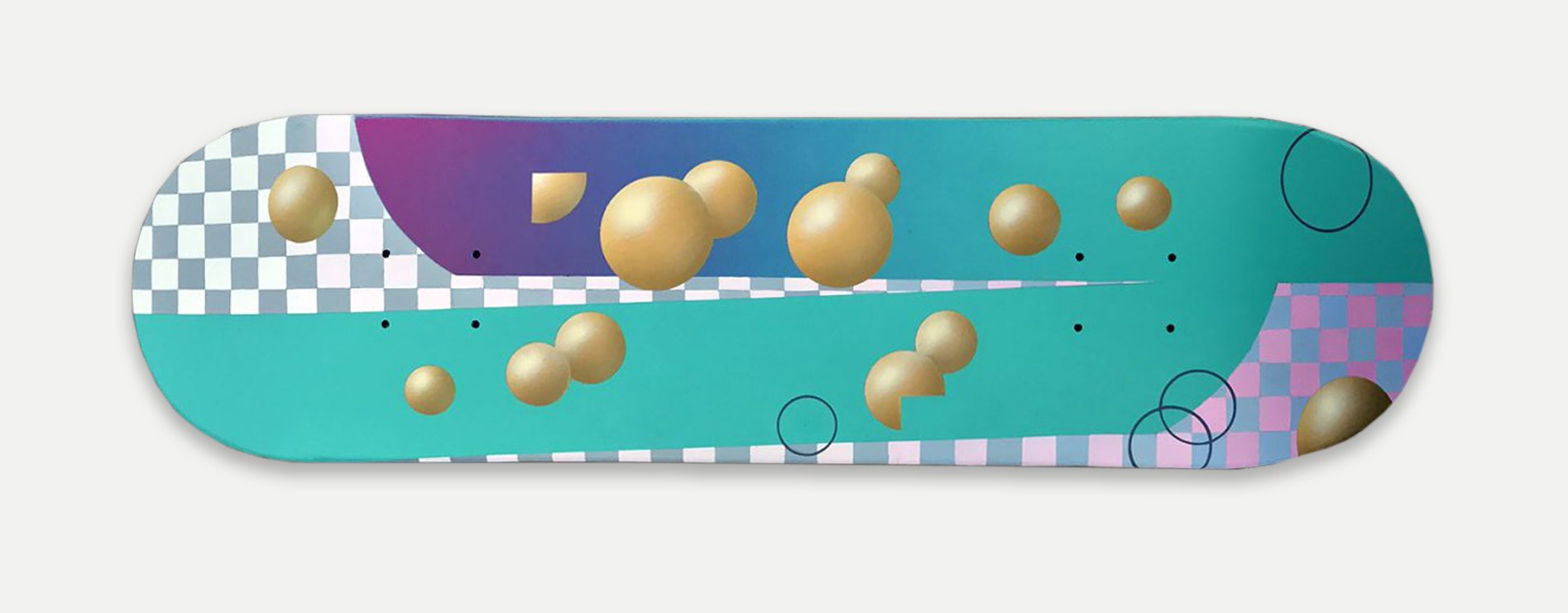 By translating painterly illusion onto an object associated with movement and subculture, the work collapses distinctions between fine art, design and street culture. The skate deck becomes both support and stage, carrying a language of virtual space, geometry and suspension into a functional, portable form.
